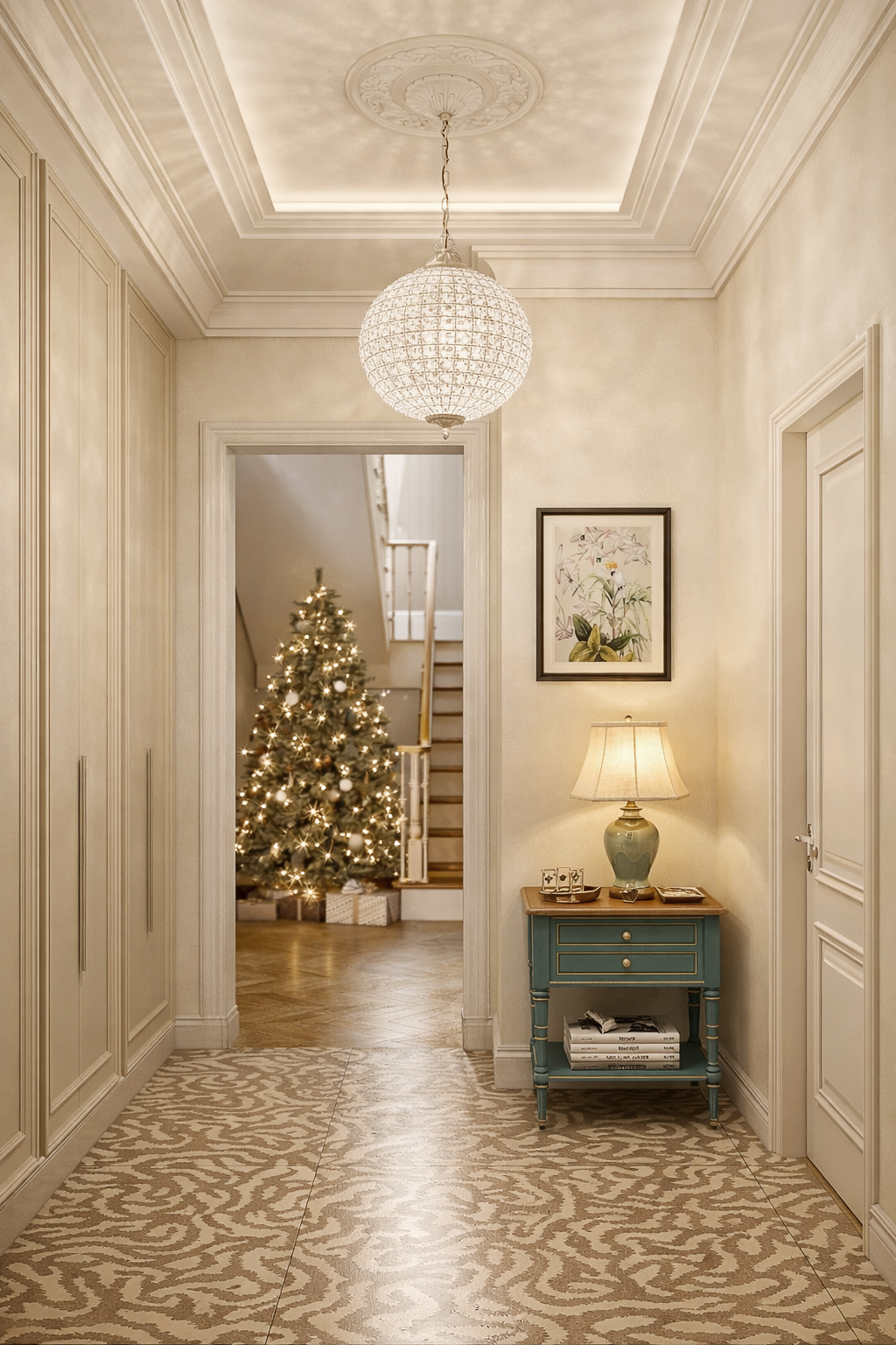 Светлая прихожая в современной неоклассике с молдингами и декоративной плиткой на полу.