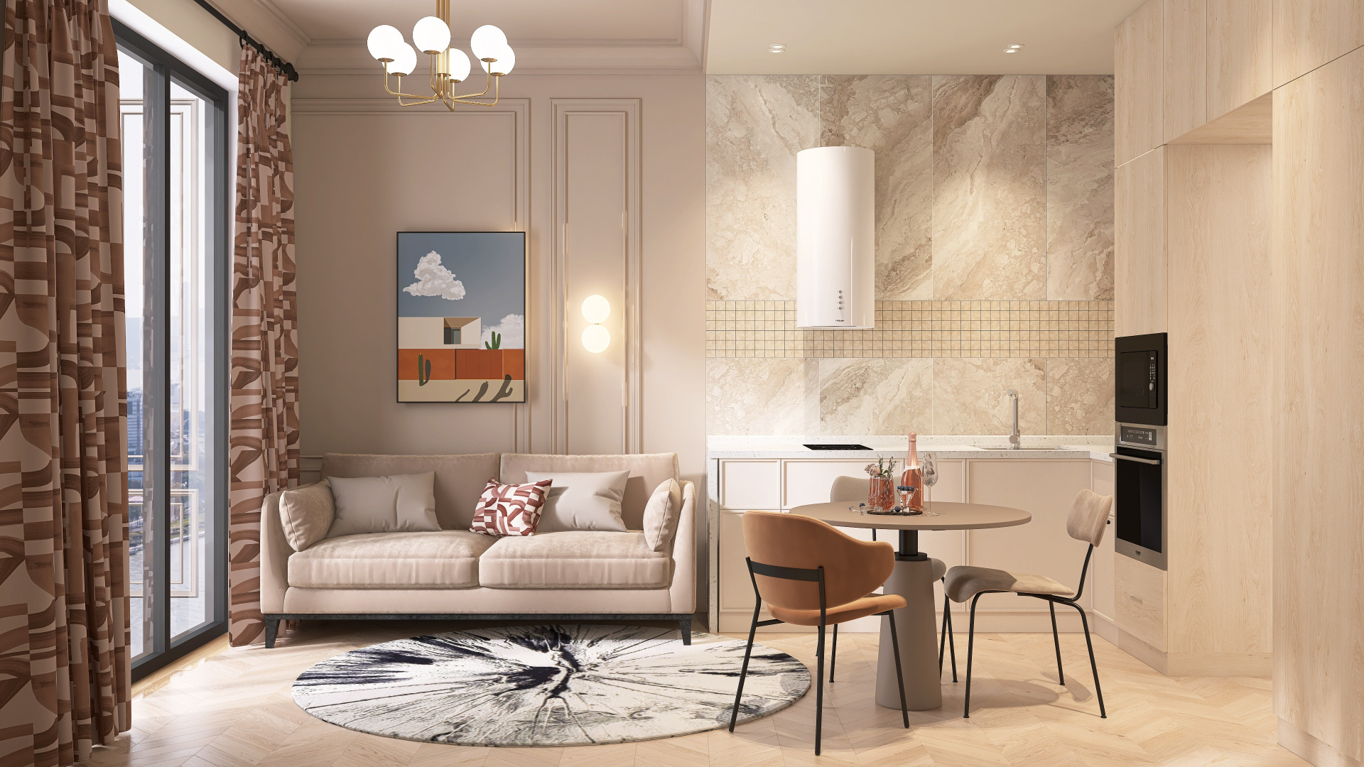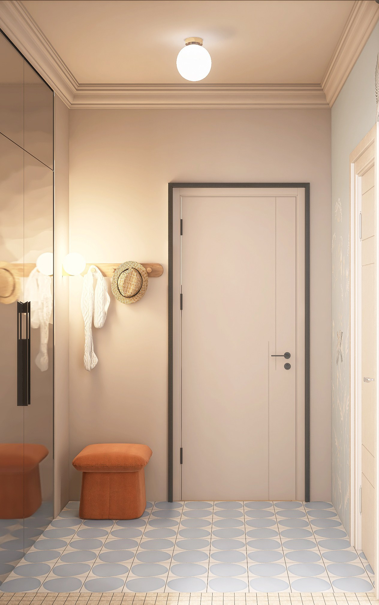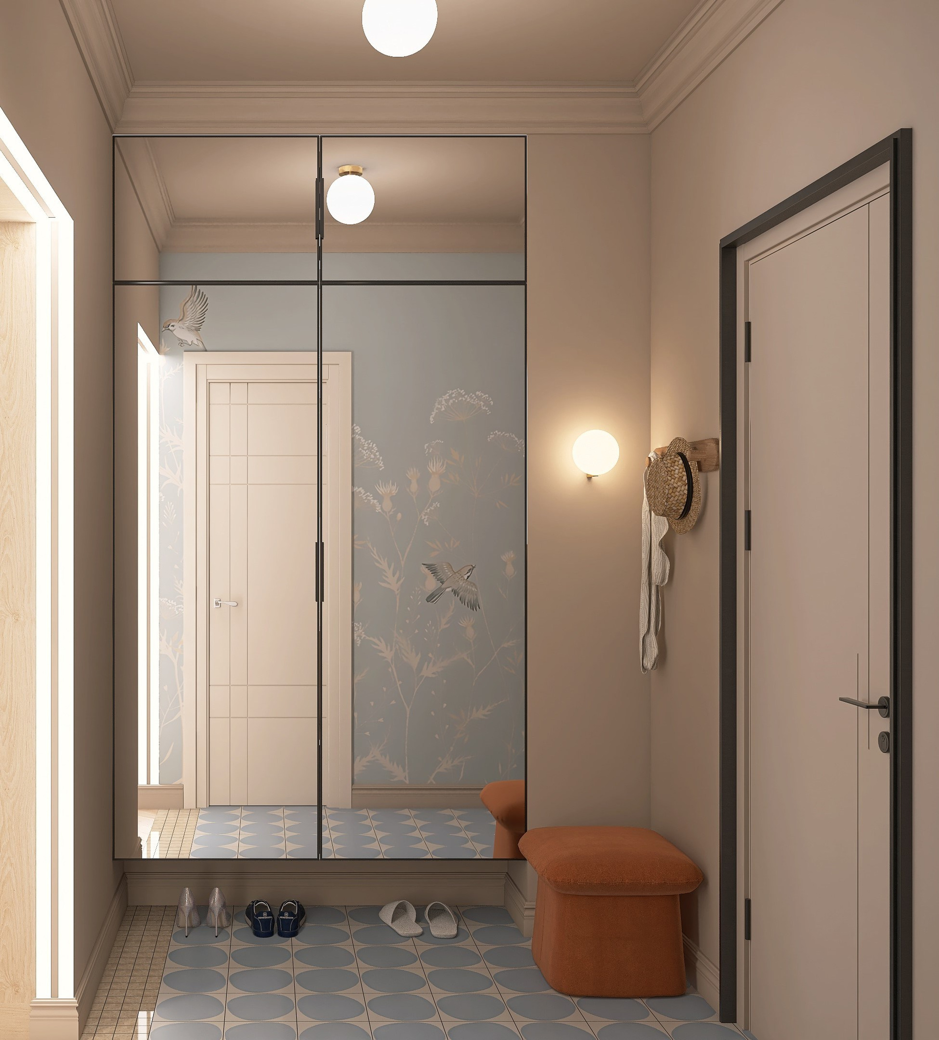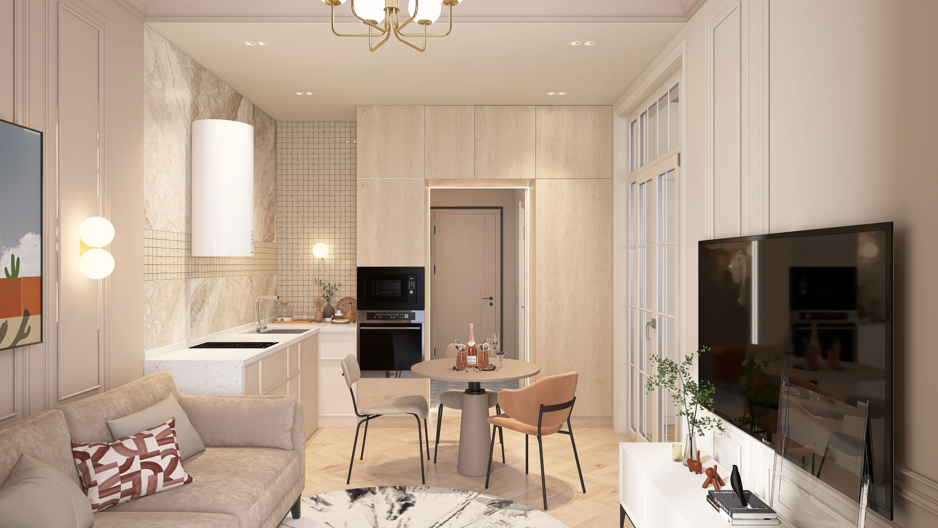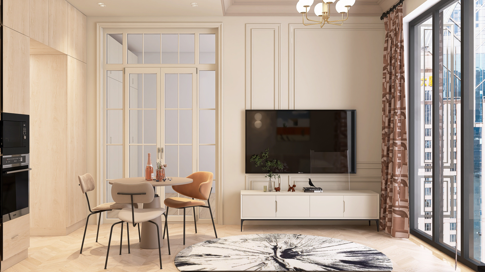 Квартира-студия в Новосибирске для проживания молодой женщины. В приоритете — уют, спокойствие, неоклассика приперченная сочетаниями джапанди и немного изюма. Планировка не претерпела значительных изменений, но работа с встроенной мебелью и цветом позволила зонировать пространство без перестановки стен