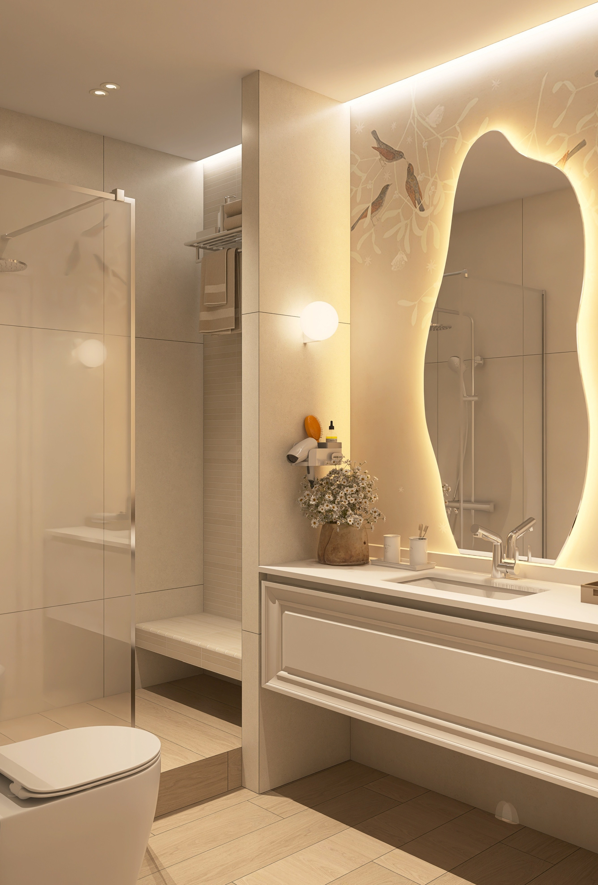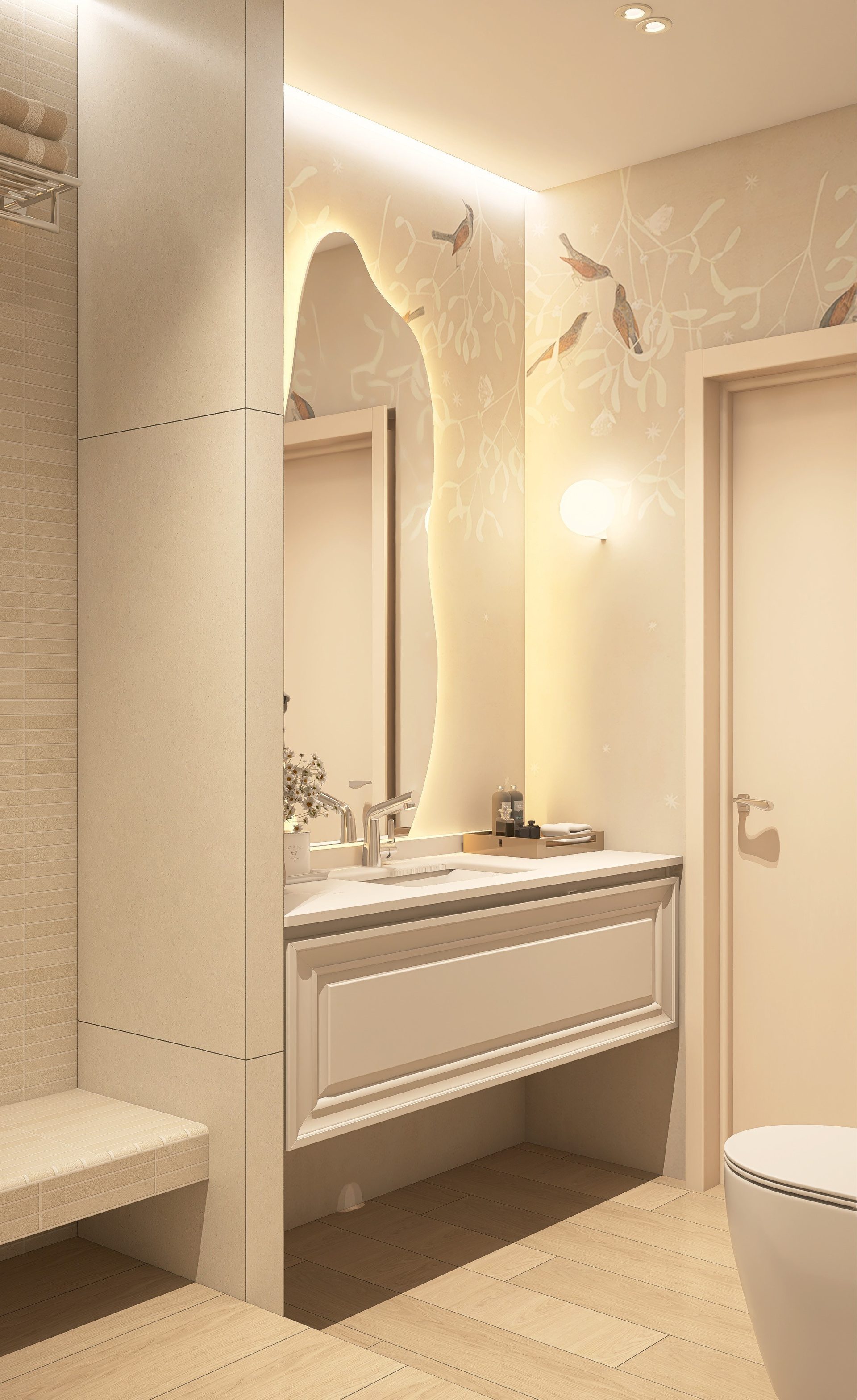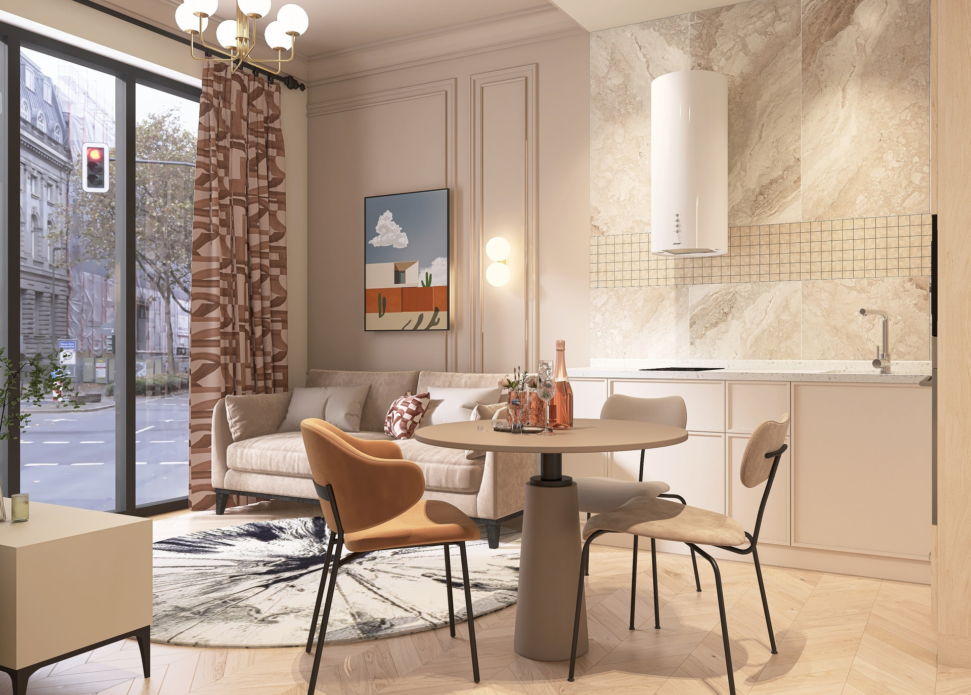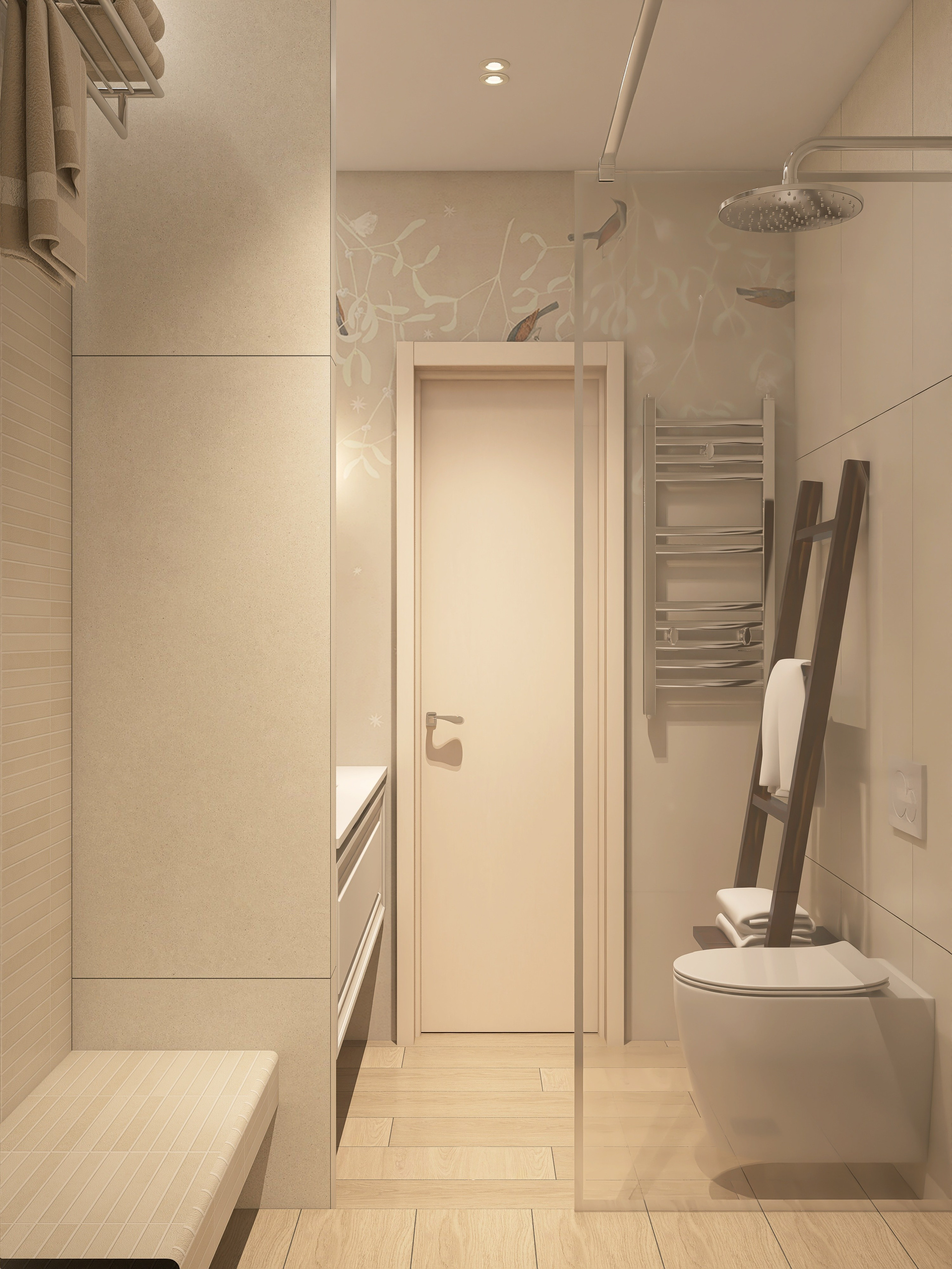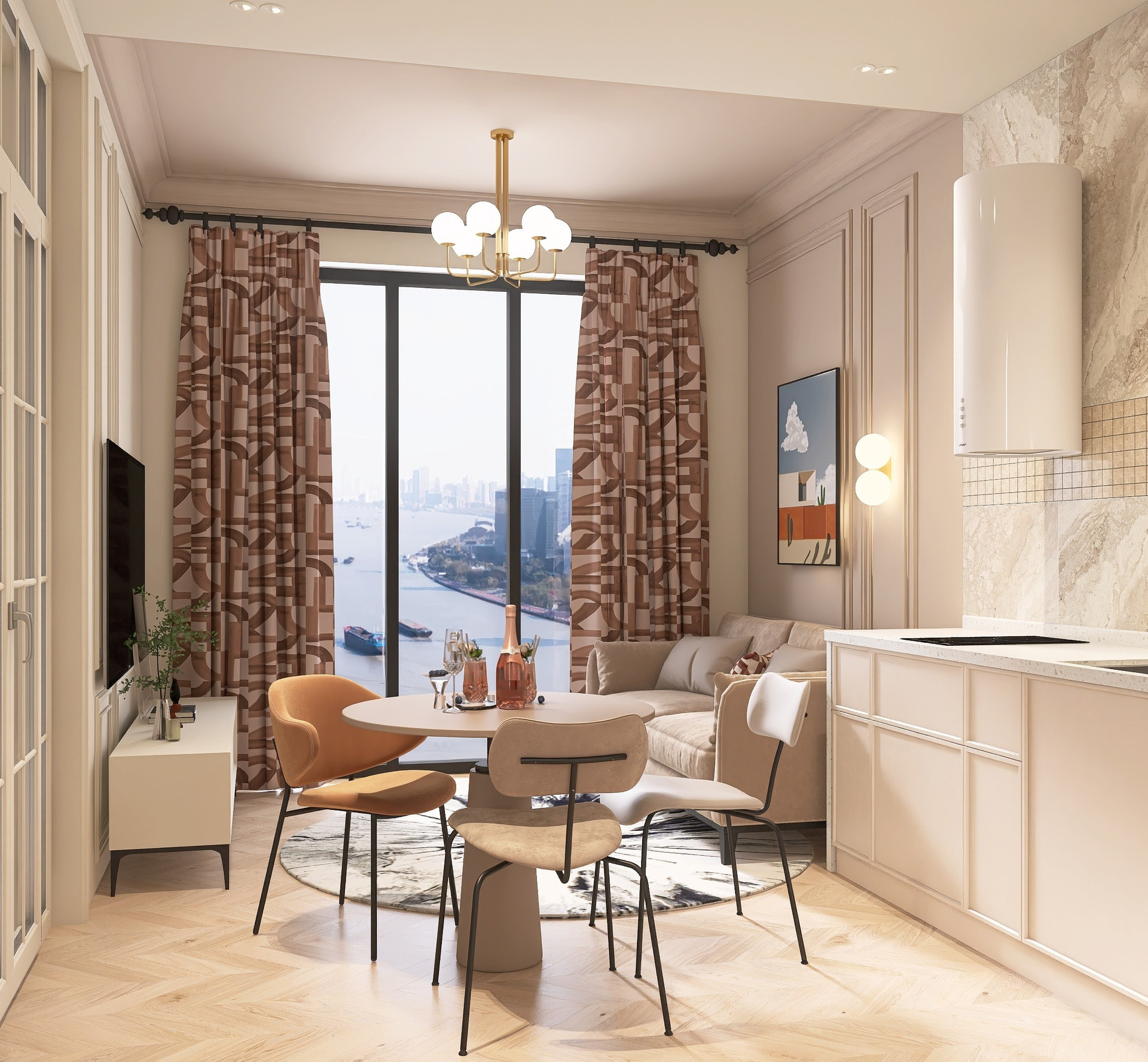 Квартира-студия в Новосибирске для проживания молодой женщины. В приоритете — уют, спокойствие, неоклассика приперченная сочетаниями джапанди и немного изюма. Планировка не претерпела значительных изменений, но работа с встроенной мебелью и цветом позволила зонировать пространство без перестановки стен